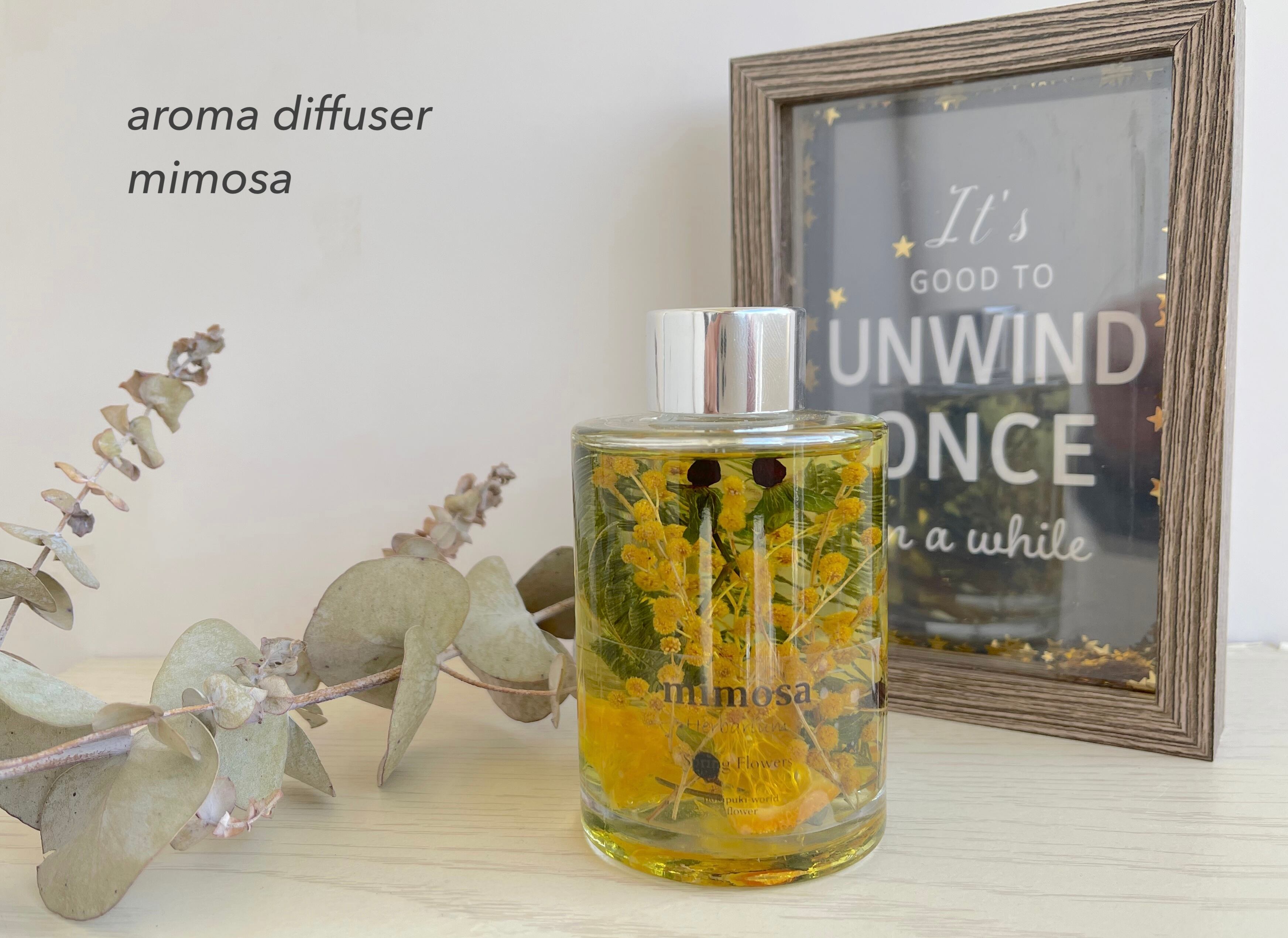 お部屋のアクセントになるミモザのボタニカルハーバリウムディフューザーで、